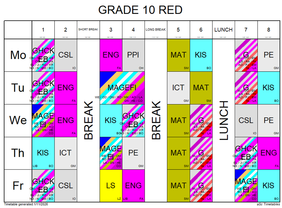 Sample Timetable for Grade 10 Red (Social Sciences)